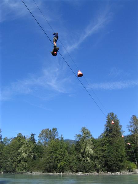 Jason crosses the Squamish River. The cable car is not accesible to the public.