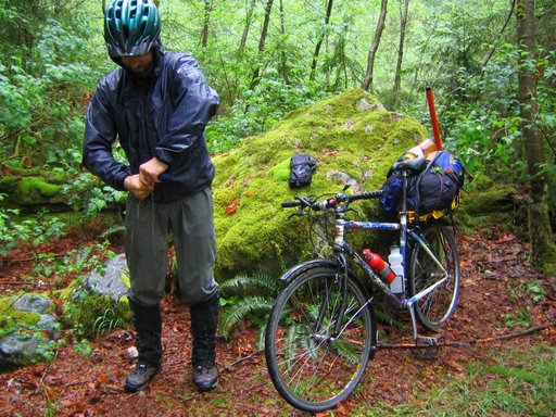 I love biking in the rain! Weeeeee! Damien rings his gloves out in preparation.