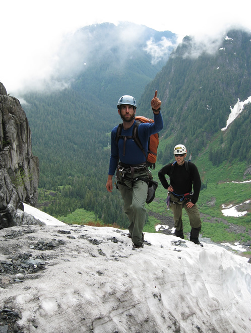 Damien (left) and Karl (right) pose in the unroped 2nd section which gains the arete.