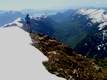 I woke up Sunday morning with Jason wafting coffee through my bivy opening. As pleasant as that was, I must admit to feeling a great deal of trepidation about the day's climb. Our route (following the ridge between sun and shade in the above photo) required "fourth-classing" a few pitches of steep, bushy, groany rock. But as soon as I started climbing the confidence returned.