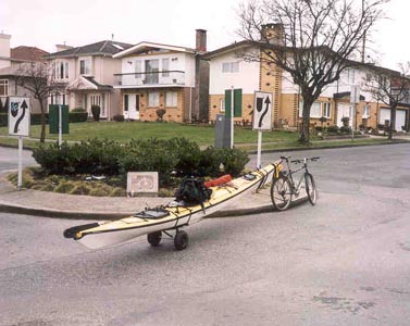 with a trailer full of gear and I with a canoe behind my bike (full of