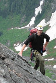 Once we determined where the start of the climb was, we realized that we had climbed higher than it, and basically skipped a section of the arête. We were not unhappy about this. Having shortened the route, we would gain back a little bit of daylight. We scrambles unroped for a short ways on solid rock coated with patches of loose gravel. At a large block we roped up for a deceptively difficult 3 meters of climbing and continued simuling up the large wide ramp. Sparse gear ended that configuration about mid way up. Below the mid-point, in a zone of polished rock, a significant block of compacted snow and ice slid down the ramp. This struck a chord in me, because of the fatality on Slesse earlier in the season, where a local man had been swept to his death by a similar block. This years summer conditions were late coming, so heads up to future ascensionist under similar conditions as icefall may again prove dangerous.